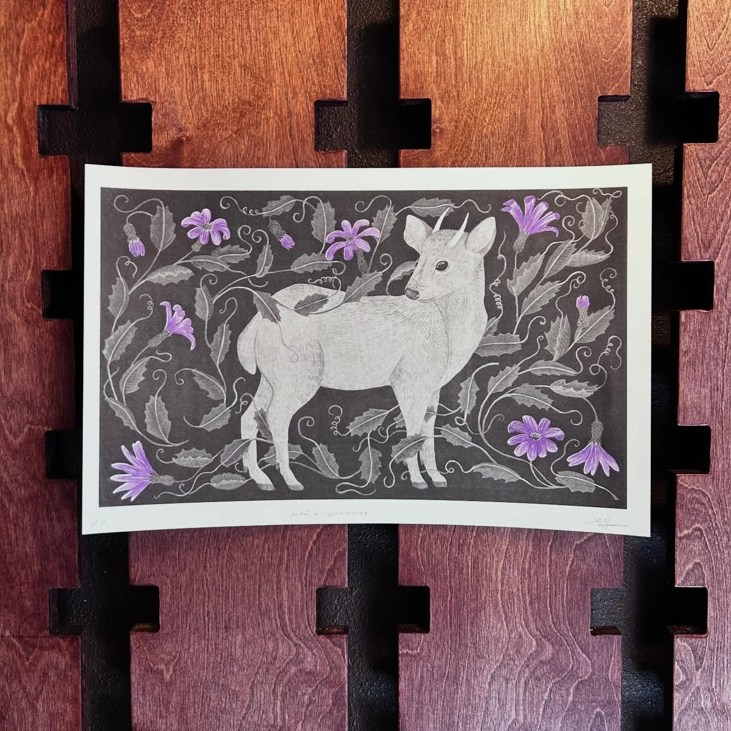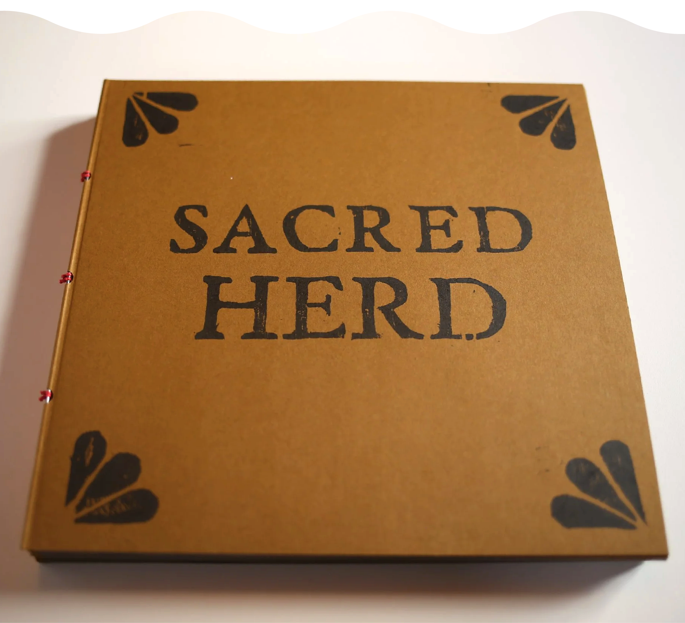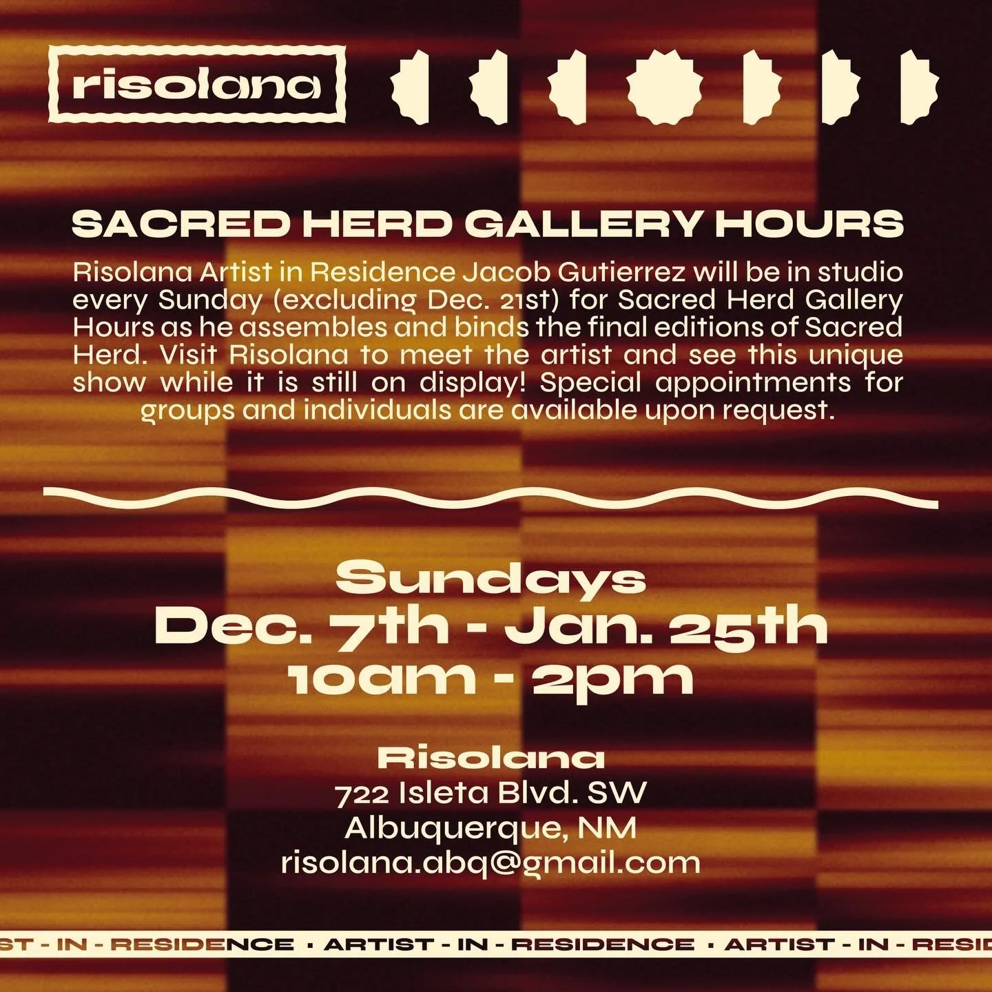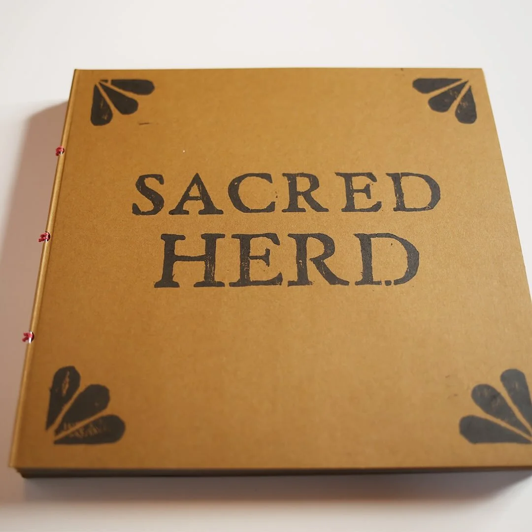 In a time marked by increased communication but diminished connection, ranchers and sheepherders still honor the profound reciprocal relationship shared between humans and animals, understanding that both beings exist because of the other. During his residency with Risolana, Gutierrez visited ranches and herds across New Mexico and the Navajo Nation, honoring these animals through photographs, stories, and hand-carved woodblock prints ultimately translated into risograph prints displayed in his one-of-a-kind artbook. Sacred Herd is the culmination of seven months spent sharing meals, tending to livestock, and learning about sacred human-animal connections.