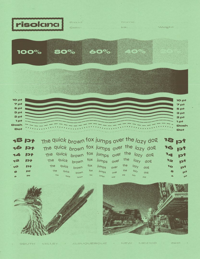 A light green design sheet with the Risolana logo at the top. It features various font size samples, lines, and text repetitions of 'The quick brown fox jumps over the lazy dog.' There is a drawing of a bird at the bottom left and a photo of a city street at the bottom right. The text at the bottom indicates South Valley, Albuquerque, New Mexico, 2021.